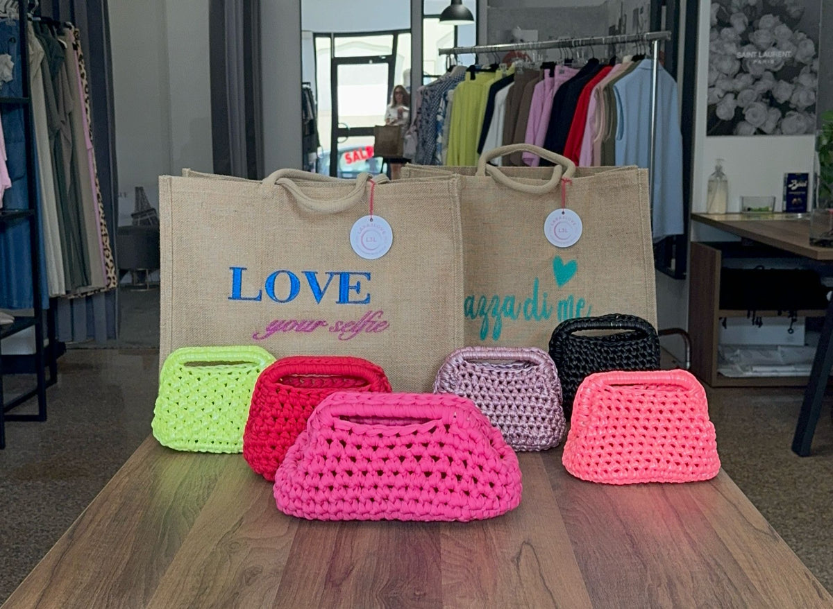 Scopri la Collezione LARA3LOVE: Artigianalità e Personalizzazione Uniche La collezione LARA3LOVEè pensata per chi cerca uno stile autentico e distintivo. Ogni borsa, realizzata interamente a mano all'uncinetto, è una creazione esclusiva, che puoi personalizzare scegliendo tra vari colori e forme. Ogni punto, ogni dettaglio è curato con passione per offrirti un accessorio che non è solo bello, ma anche unico. Anche le magliette della collezione LARA3LOVE possono essere personalizzate secondo il tuo gusto. Puoi scegliere tra stampe originali e ricami eleganti, per un capo che parla di te e della tua personalità. La bellezza della collezione LARA3LOVE sta nell'artigianalità: ogni pezzo è realizzato con dedizione e amore per il dettaglio, per offrirti un prodotto che si distingue per la qualità e l'originalità. Scegli LARA3LOVE per portare con te l'eleganza dell'artigianato e l'unicità del fatto a mano.